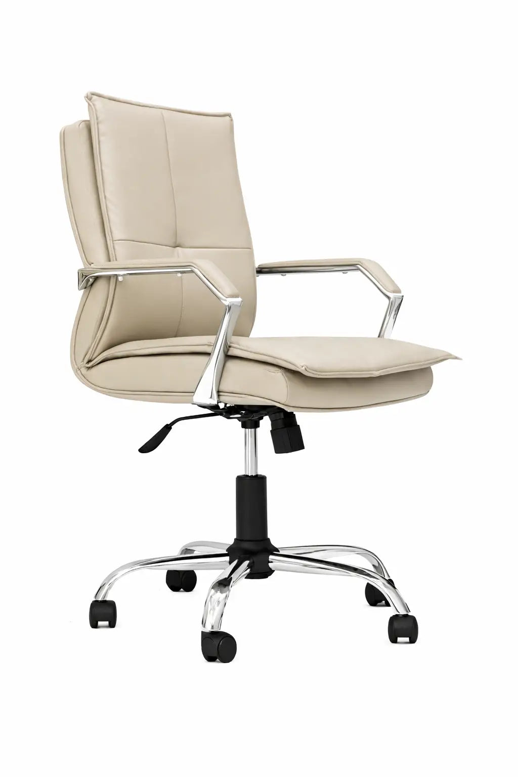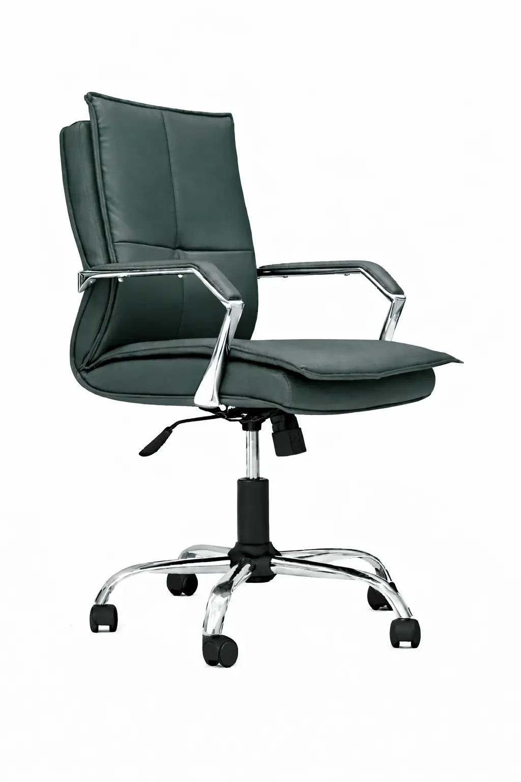 Upholstered seat and back, padded chrome arms, normal tilting mechanism and chrome base