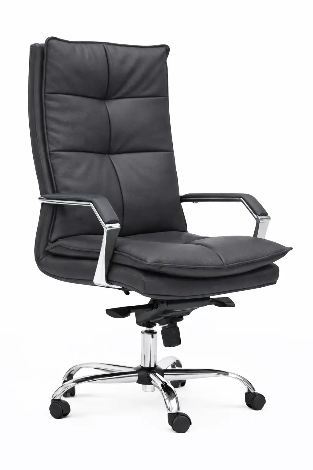 Upholstered seat and back, padded chrome arms, knee tilting mechanism and chrome base