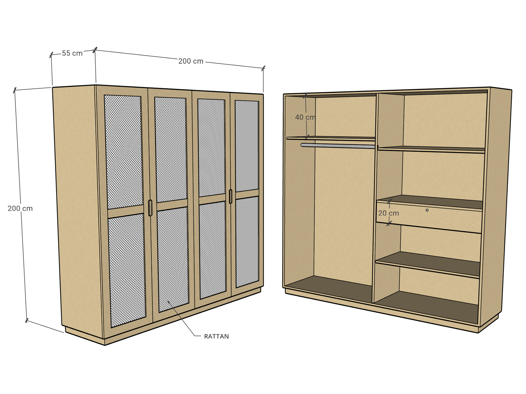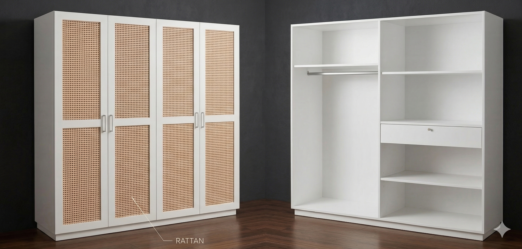 Contact us: If any customization needs to be made on the 4 Door Rattan Wardrobe, Custom Made, in terms of size, storage or colors of wood, please inform our team via WhatsApp on +971 4 3353291.