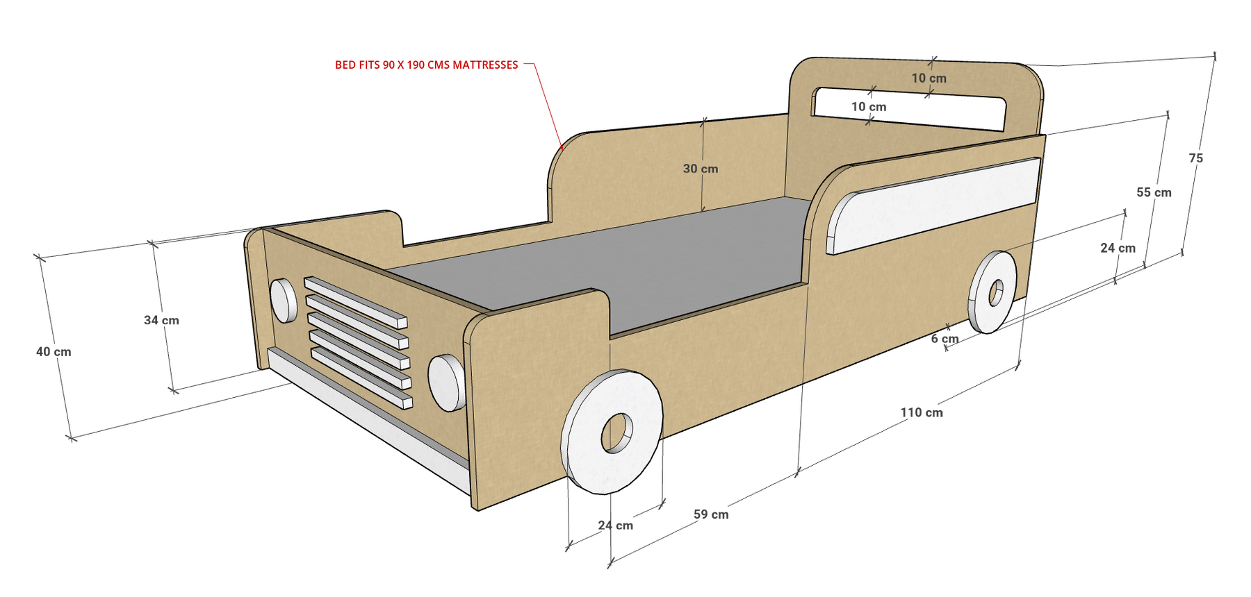 - Below Mattress: 18mm thick MDF white sheet